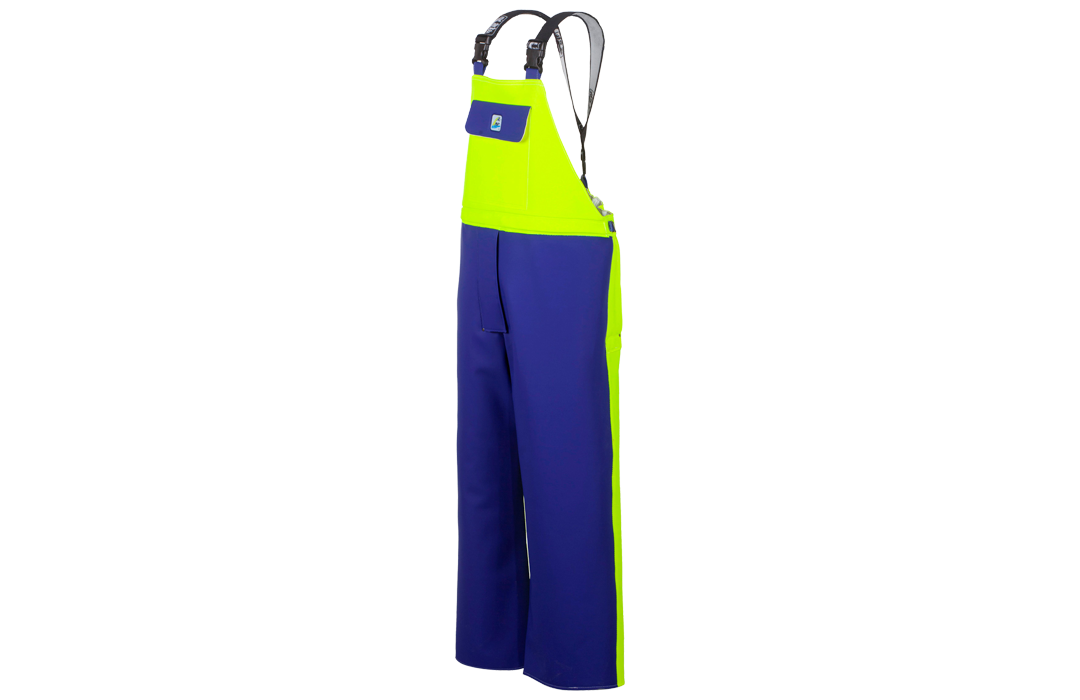 Peto con bragueta y tapeta de cierre con velcro, tirantes elásticos ajustables, bolsillo en el pecho y cierre lateral con hebilla.