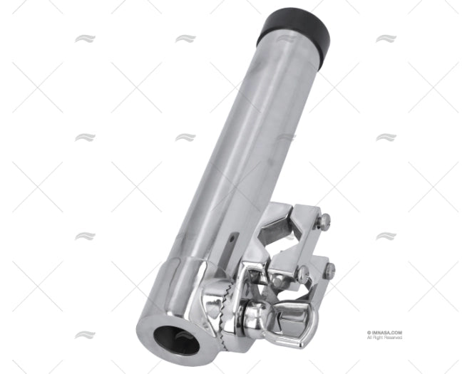 Portacañas de superficie fabricado en acero inoxidable AISI 316, con tubo de Ø40 mm e incluyendo aro protector de PVC para evitar daños a las cañas. La base, de 93 x 63 mm, permite instalación en orientación horizontal o vertical y admite ajustes en el ángulo según necesidad. El tubo mide 255 mm y alcanza una altura total de 355 mm, proporcionando una sujeción firme y resistente en ambientes marinos. Elaborado en inox 316 para máxima durabilidad frente a la corrosión.